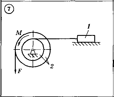 Д4 ЗАДАНИЕ 2: Для представленных на рисунках схем 1-30, используя принцип Лагранжа, определить величину силы F (при наличии трения — максимальное значение этой величины), при которой механическая система будет находиться в равновесии. Исходные данные: вес груза G1 = 20 кН, вращающий момент М = 1 кН*м, радиус барабана R2 = 0,4 м (у двойного барабана имеется также r2=0,2 м), угол а = 30° и коэффициент трения скольжения f = 0,5. Ненумерованные блоки и катки считать невесомыми. Трением на осях барабана и блоков пренебречь.