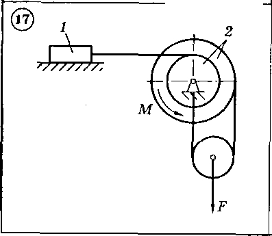 Д4 ЗАДАНИЕ 2: Для представленных на рисунках схем 1-30, используя принцип Лагранжа, определить величину силы F (при наличии трения — максимальное значение этой величины), при которой механическая система будет находиться в равновесии. Исходные данные: вес груза G1 = 20 кН, вращающий момент М = 1 кН*м, радиус барабана R2 = 0,4 м (у двойного барабана имеется также r2=0,2 м), угол а = 30° и коэффициент трения скольжения f = 0,5. Ненумерованные блоки и катки считать невесомыми. Трением на осях барабана и блоков пренебречь.