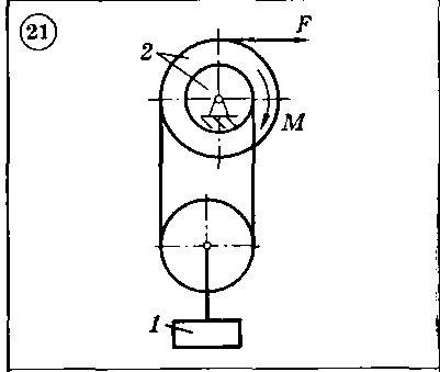 Д4 ЗАДАНИЕ 2: Для представленных на рисунках схем 1-30, используя принцип Лагранжа, определить величину силы F (при наличии трения — максимальное значение этой величины), при которой механическая система будет находиться в равновесии. Исходные данные: вес груза G1 = 20 кН, вращающий момент М = 1 кН*м, радиус барабана R2 = 0,4 м (у двойного барабана имеется также r2=0,2 м), угол а = 30° и коэффициент трения скольжения f = 0,5. Ненумерованные блоки и катки считать невесомыми. Трением на осях барабана и блоков пренебречь.