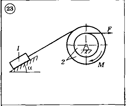 Д4 ЗАДАНИЕ 2: Для представленных на рисунках схем 1-30, используя принцип Лагранжа, определить величину силы F (при наличии трения — максимальное значение этой величины), при которой механическая система будет находиться в равновесии. Исходные данные: вес груза G1 = 20 кН, вращающий момент М = 1 кН*м, радиус барабана R2 = 0,4 м (у двойного барабана имеется также r2=0,2 м), угол а = 30° и коэффициент трения скольжения f = 0,5. Ненумерованные блоки и катки считать невесомыми. Трением на осях барабана и блоков пренебречь.