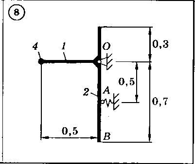Д7 ЗАДАНИЕ 1 - СВОБОДНЫЕ КОЛЕБАНИЯ: Для приведенных на схемах 1-30 механических систем определить собственную частоту колебаний. Механические системы, показанные на схемах в положении равновесия, могут совершать свободные колебания, вращаясь вокруг горизонтальной оси z, проходящей через неподвижную точку О. Системы состоят из жестко скрепленных друг с другом тел: тонких однородных стержней 1 и 2 или однородной пластины 3 и точечных грузов 4. Масса 1 м длины стержней равна 25 кг, масса 1 м2 площади пластины — 50 кг, масса точечного груза — 20 кг. Упругие элементы имеют коэффициент жесткости с = 10 кН/м. Размеры ча-стей системы указаны в метрах.
