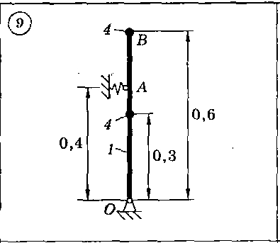 Д7 ЗАДАНИЕ 1 - СВОБОДНЫЕ КОЛЕБАНИЯ: Для приведенных на схемах 1-30 механических систем определить собственную частоту колебаний. Механические системы, показанные на схемах в положении равновесия, могут совершать свободные колебания, вращаясь вокруг горизонтальной оси z, проходящей через неподвижную точку О. Системы состоят из жестко скрепленных друг с другом тел: тонких однородных стержней 1 и 2 или однородной пластины 3 и точечных грузов 4. Масса 1 м длины стержней равна 25 кг, масса 1 м2 площади пластины — 50 кг, масса точечного груза — 20 кг. Упругие элементы имеют коэффициент жесткости с = 10 кН/м. Размеры ча-стей системы указаны в метрах.