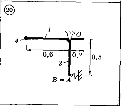 Д7 ЗАДАНИЕ 1 - СВОБОДНЫЕ КОЛЕБАНИЯ: Для приведенных на схемах 1-30 механических систем определить собственную частоту колебаний. Механические системы, показанные на схемах в положении равновесия, могут совершать свободные колебания, вращаясь вокруг горизонтальной оси z, проходящей через неподвижную точку О. Системы состоят из жестко скрепленных друг с другом тел: тонких однородных стержней 1 и 2 или однородной пластины 3 и точечных грузов 4. Масса 1 м длины стержней равна 25 кг, масса 1 м2 площади пластины — 50 кг, масса точечного груза — 20 кг. Упругие элементы имеют коэффициент жесткости с = 10 кН/м. Размеры ча-стей системы указаны в метрах.