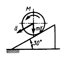 По неподвижной призме катится цилиндр массой m = 10 кг под действием силы тяжести и пары сил с моментом М. Ускорение центра масс цилиндра а = 6 м/с2. Определить гори­зонтальную составляющую реакции опорной плоскости на призму. (Ответ 52,0)