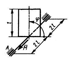Однородная прямоугольная пластина мас­сой 6 кг вращается под действием пары сил с моментом М согласно уравнению φ = 5t3. Ось вращения перпендикулярна плоскости пласти­ны. Определить модуль динамической реакции подшипника А в момент времени t = 1 с. Размер l = 0,2 м. (Ответ 68,1)