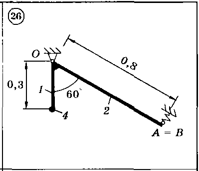 Д7 ЗАДАНИЕ 1 - СВОБОДНЫЕ КОЛЕБАНИЯ: Для приведенных на схемах 1-30 механических систем определить собственную частоту колебаний. Механические системы, показанные на схемах в положении равновесия, могут совершать свободные колебания, вращаясь вокруг горизонтальной оси z, проходящей через неподвижную точку О. Системы состоят из жестко скрепленных друг с другом тел: тонких однородных стержней 1 и 2 или однородной пластины 3 и точечных грузов 4. Масса 1 м длины стержней равна 25 кг, масса 1 м2 площади пластины — 50 кг, масса точечного груза — 20 кг. Упругие элементы имеют коэффициент жесткости с = 10 кН/м. Размеры ча-стей системы указаны в метрах.