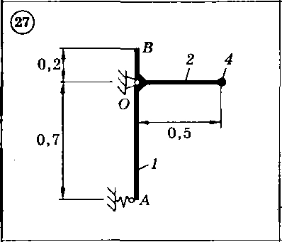 Д7 ЗАДАНИЕ 1 - СВОБОДНЫЕ КОЛЕБАНИЯ: Для приведенных на схемах 1-30 механических систем определить собственную частоту колебаний. Механические системы, показанные на схемах в положении равновесия, могут совершать свободные колебания, вращаясь вокруг горизонтальной оси z, проходящей через неподвижную точку О. Системы состоят из жестко скрепленных друг с другом тел: тонких однородных стержней 1 и 2 или однородной пластины 3 и точечных грузов 4. Масса 1 м длины стержней равна 25 кг, масса 1 м2 площади пластины — 50 кг, масса точечного груза — 20 кг. Упругие элементы имеют коэффициент жесткости с = 10 кН/м. Размеры ча-стей системы указаны в метрах.