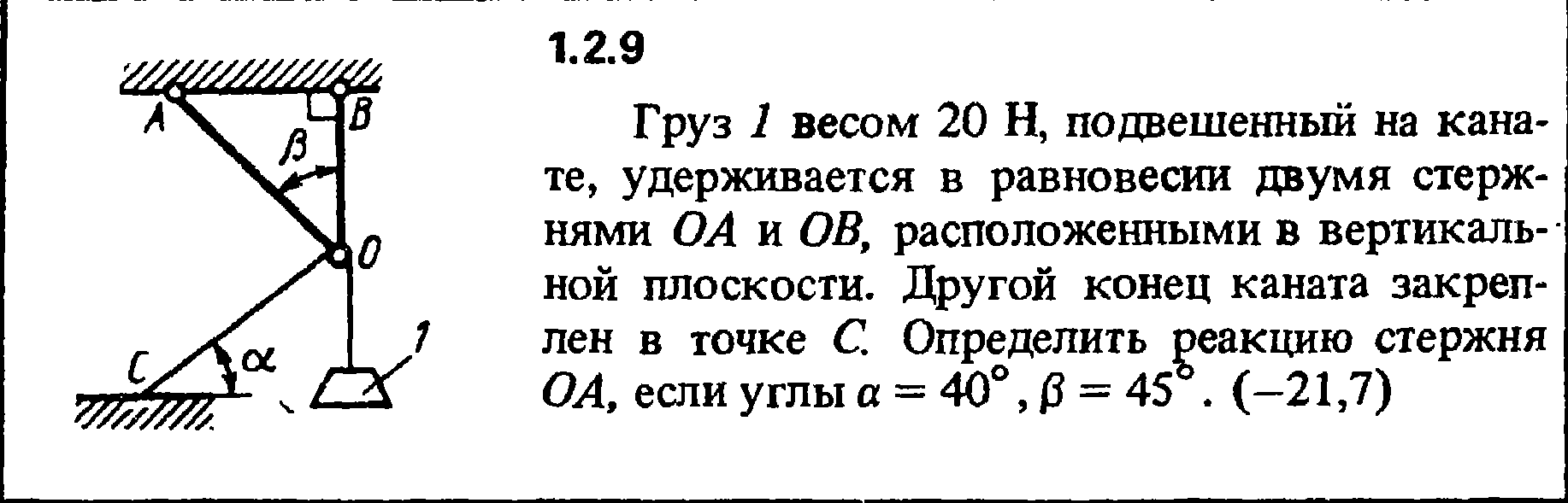 Груз 1 весом 20 Н, подвешенный на канате, удерживается в равновесии двумя стержнями OА и ОВ, расположенными в вертикальной плоскости. Другой конец каната закреплен в точке С. Определить реакцию стержня ОА, если углы a = 40°, b = 45°