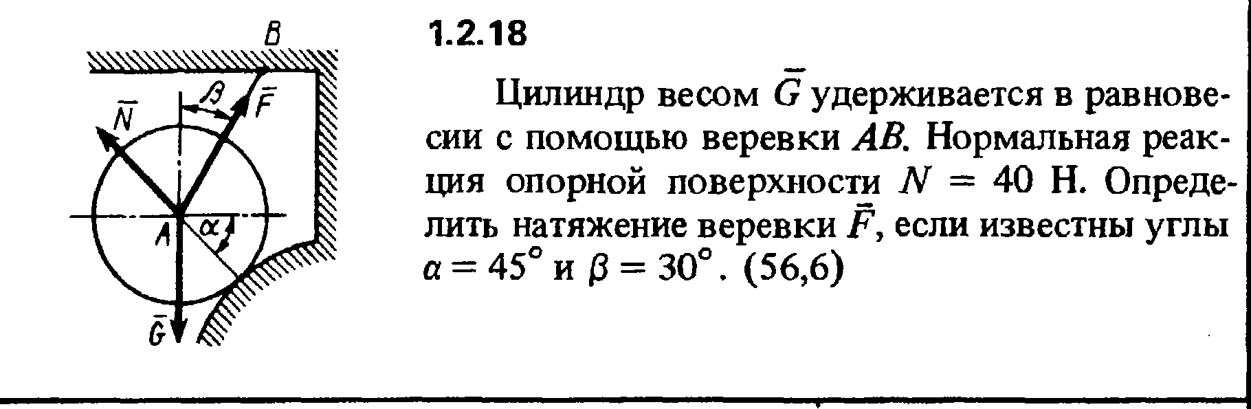 Цилиндр весом G удерживается в равновесии с помощью веревки АВ. Нормальная реакция опорной поверхности N = 40 Н. Определить натяжение веревки F, если известны углы a = 45° и b = 30°.
