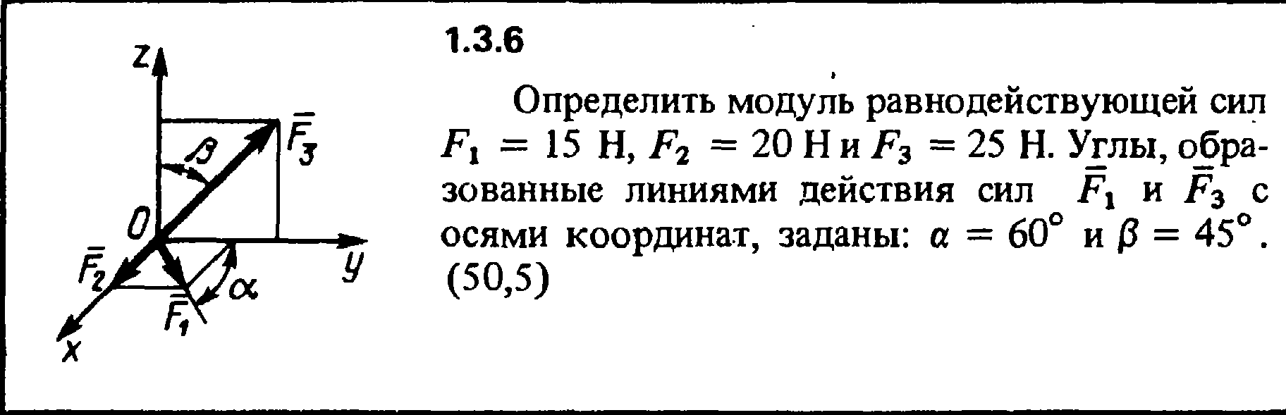 Определить модуль равнодействующей сил F1 = 15 Н, F2 = 20 Н и F3 = 25 Н. Углы, образованные линиями действия сил F1 и F3 с осями координат, заданы: a = 60° и b = 45°.