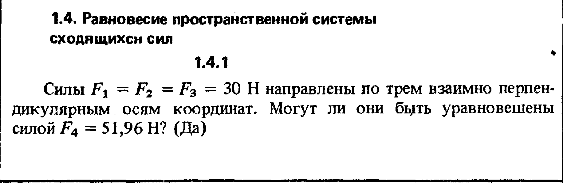 Силы F1 = F2 = F3 = 30 Н направлены по трем взаимно перпендикулярным осям координат. Могут ли они быть уравновешены силой F4 = 51,96 Н?
