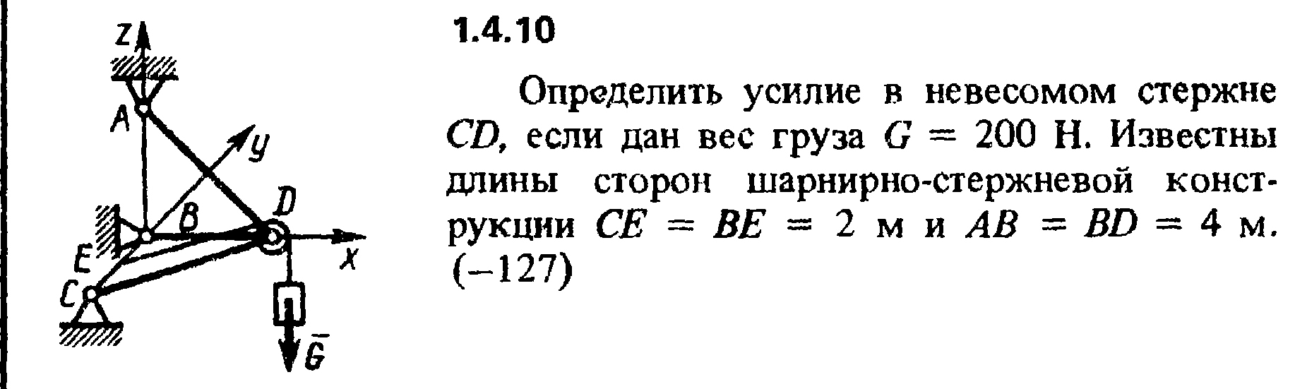 Определить усилие в невесомом стержне CD, если дан вес груза G = 200 Н. Известны длины сторон шарнирно-стержневой конструкции СЕ = BE = 2 м и АВ = BD = 4 м.