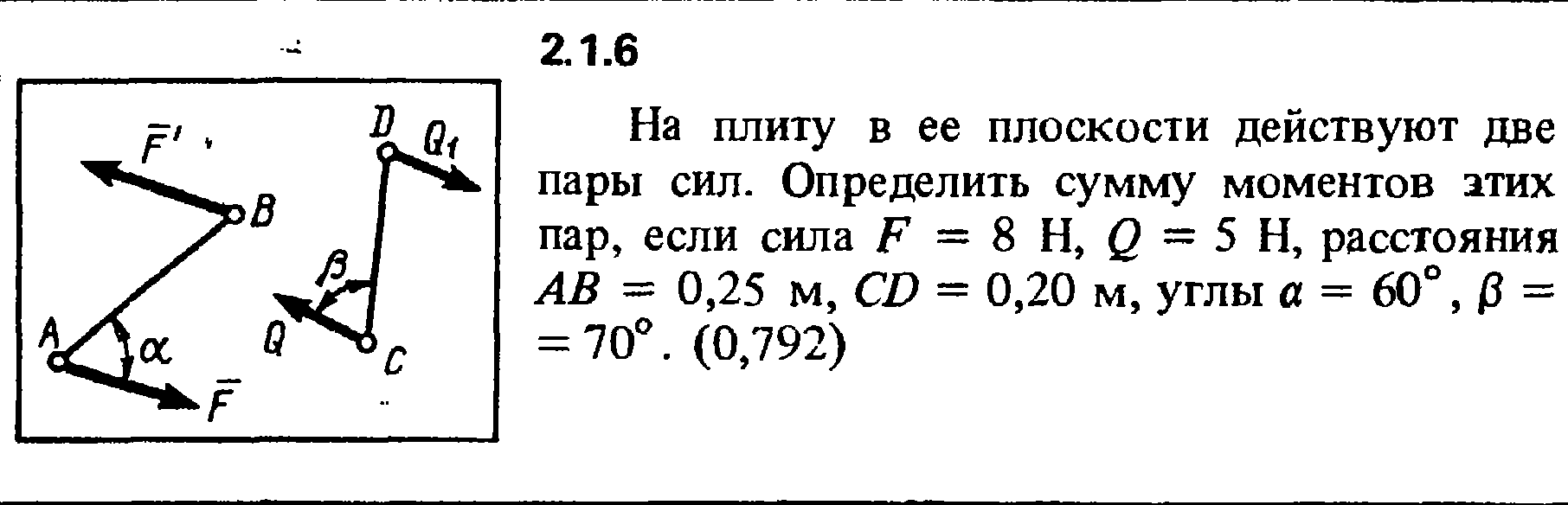 На плиту в ее плоскости действуют две пары сил. Определить сумму моментов этих пар, если сила F = 8 Н, Q = 5 Н, расстояния АВ = 0,25 м, CD = 0,20 м, углы a = 60°, b = 70°.
