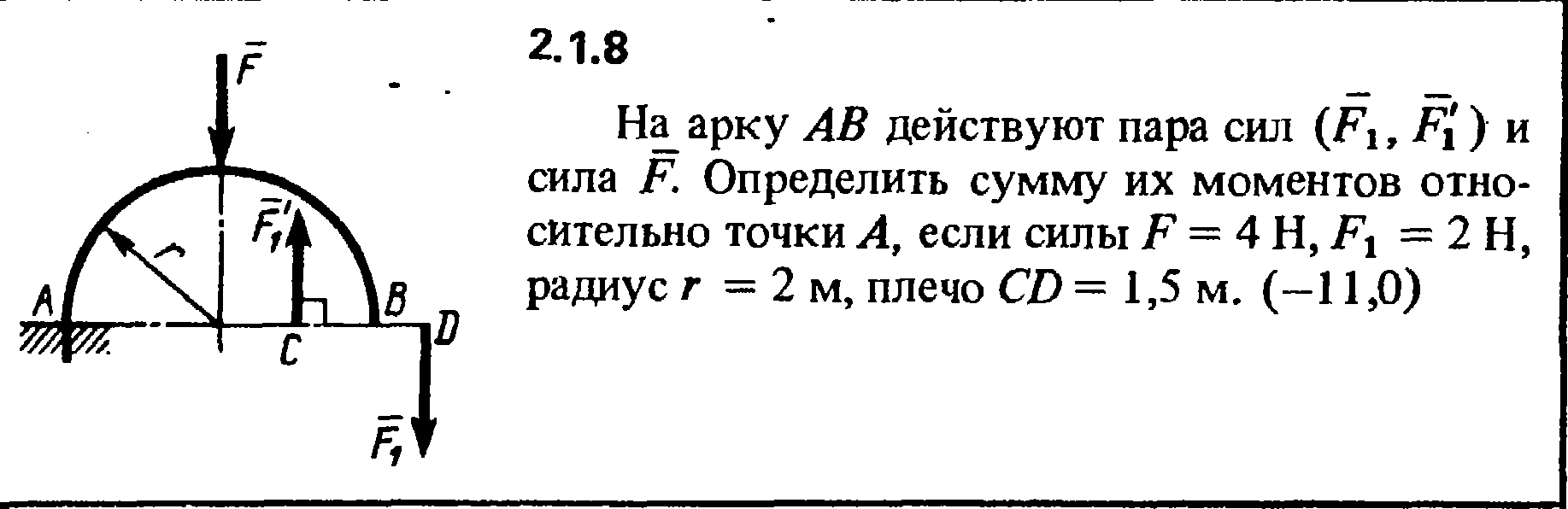 2.1.8 На арку АВ действуют пара сил (F1, F´1) и сила F. Определить сумму их моментов относительно точки А, если силы F = 4 Н, F1 = 2 Н, радиус г = 2 м, плечо CD = 1,5 м.