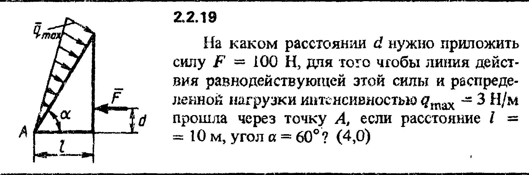 На каком расстоянии d нужно приложить силу F = 100 Н, для того чтобы линия действия равнодействующей этой силы и распределенной нагрузки интенсивностью qmax = 3 Н/м прошла через точку А, если расстояние l = 10 м, угол а = 60°?