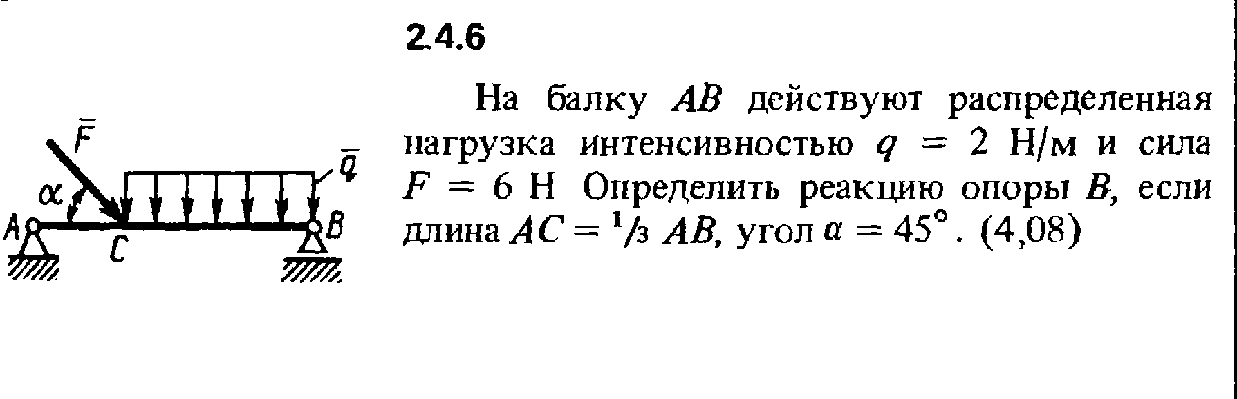 На балку АВ действуют распределенная нагрузка интенсивностью q = 2 Н/м и сила F = 6 Н. Определить реакцию опоры В, если длина АС = 1/3 АВ, угол а = 45°.