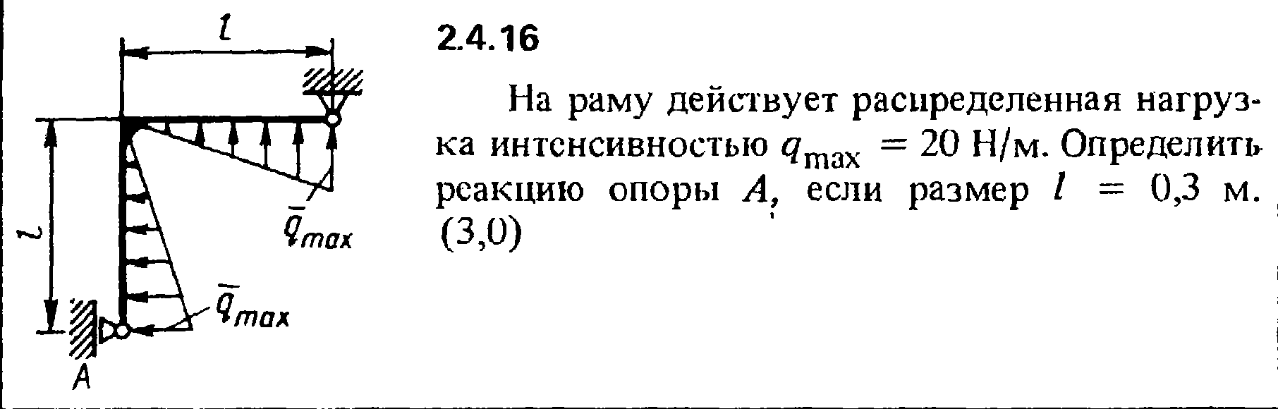 На раму действует распределенная нагрузка интенсивностью qmax = 20 Н/м. Определить реакцию опоры А, если размер l = 0,3 м.