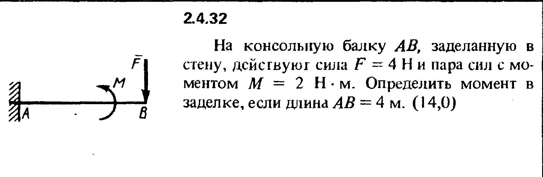 2.4.32 На консольную балку АВ, заделанную в стену, действуют сила F = 4 Н и пара сил с моментом М = 2 Н·м. Определить момент в заделке, если длина АВ = 4 м.