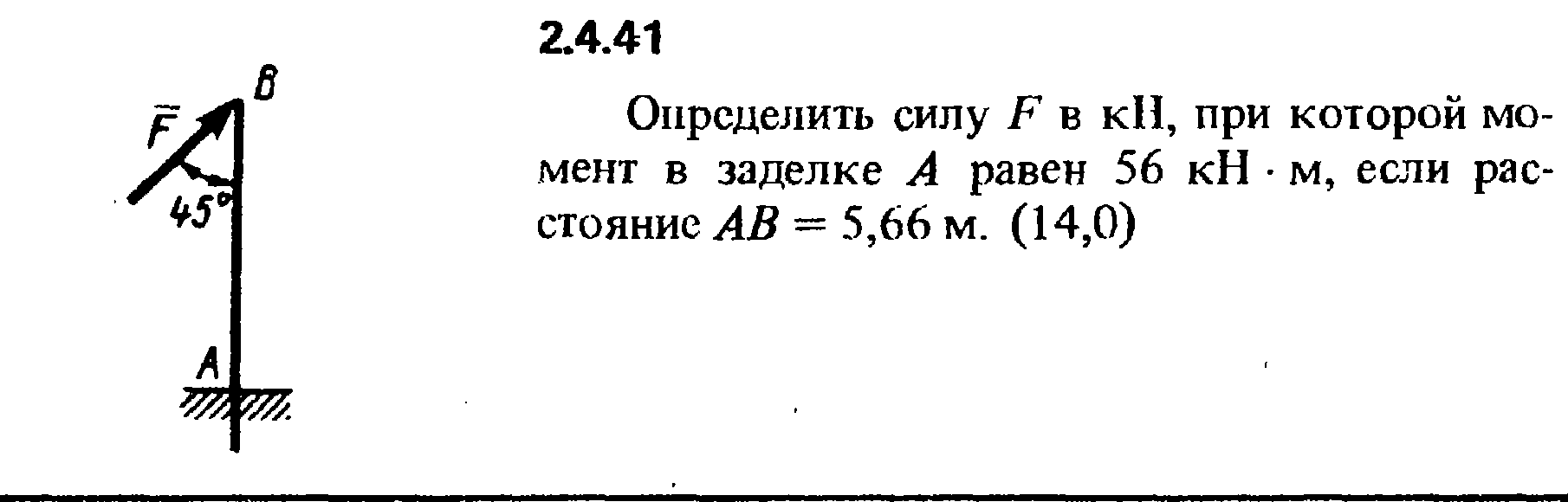 Определить силу F в кН, при которой момент в заделке А равен 56 кН·м, если расстояние АВ = 5,66 м.