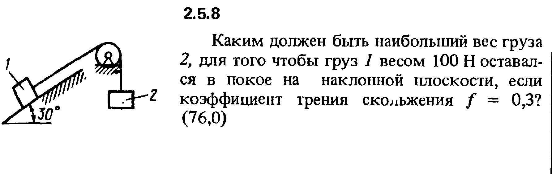 Каким должен быть наибольший вес груза 2, для того чтобы груз 1 весом 100 Н оставался в покое на наклонной плоскости, если коэффициент трения скольжения f = 0,3?