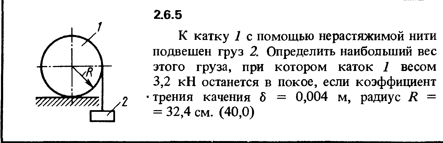 К катку 1 с помощью нерастяжимой нити подвешен груз 2. Определить наибольший вес этого груза, при котором каток 1 весом 3,2 кН останется в покое, если коэффициент трения качения δ = 0,004 м, радиус R = 32,4 см.