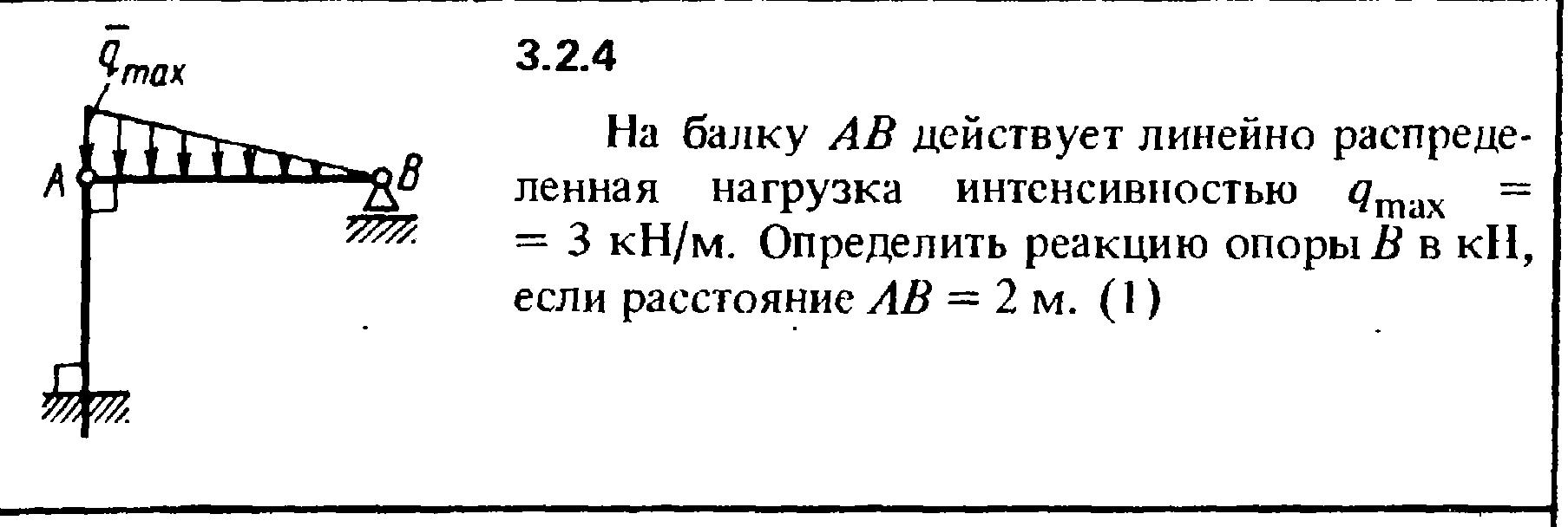 3.2.4 На балку АВ действует линейно распределенная нагрузка интенсивностью qmax = 3 кН/м. Определить реакцию опоры В в кМ, если расстояние АВ = 2 м.