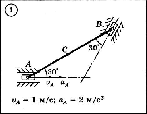 Для приведенного на схеме механизма, состоящего из шатуна AB длиной 2 м и двух ползунов, по заданным величинам скорости и ускорения ползуна A определить скорость и ускорение ползуна B и средней точки C шатуна, а также угловую скорость и угловое ускорение шатуна.