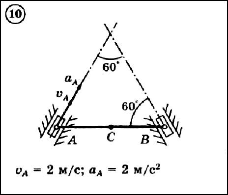 Для приведенного на схеме механизма, состоящего из шатуна AB длиной 2 м и двух ползунов, по заданным величинам скорости и ускорения ползуна A определить скорость и ускорение ползуна B и средней точки C шатуна, а также угловую скорость и угловое ускорение шатуна