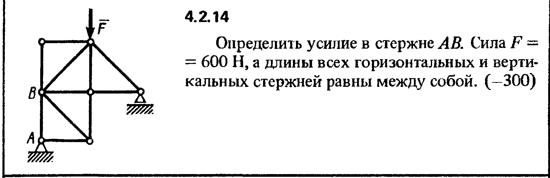 Определить усилие в стержне АВ. Сила F = 600 Н, а длины всех горизонтальных и вертикальных стержней равны между собой.