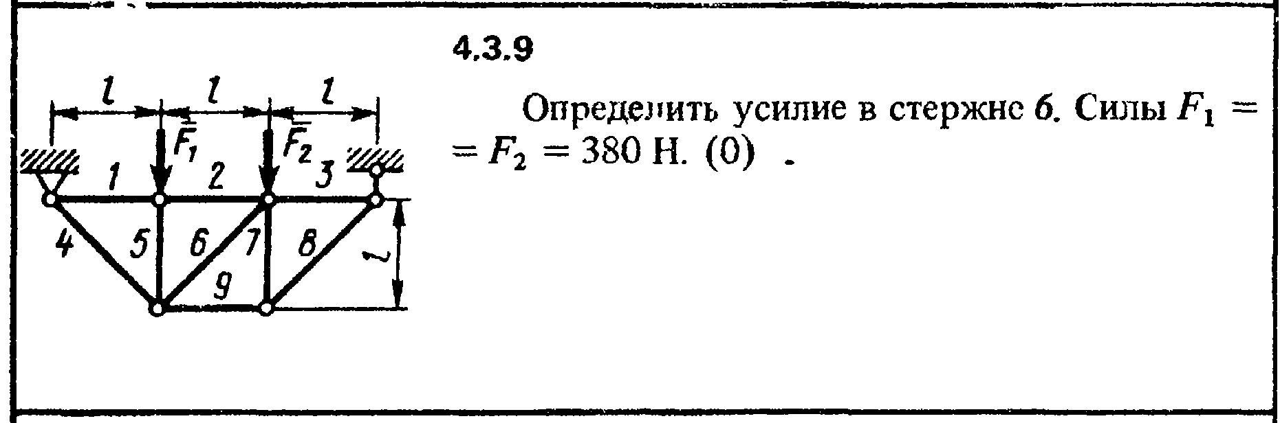 Определить усилие в стержне 6. Силы F1 = F2 = 380 Н.