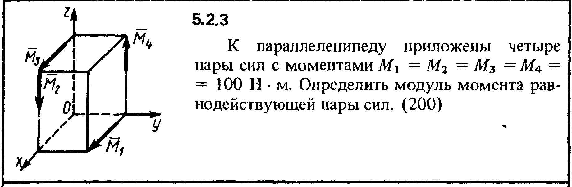К параллелепипеду приложены четыре пары сил с моментами M1 = М2 = М3 = М4 = 100 Н·м. Определить модуль момента равнодействующей пары сил.