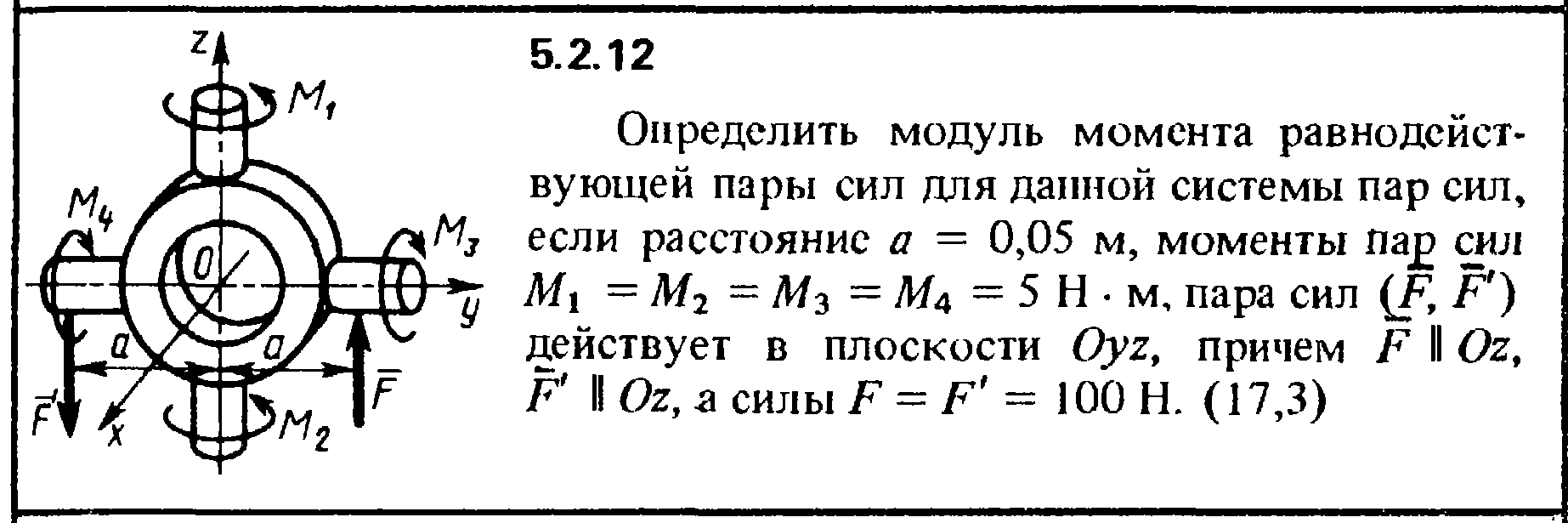 Определить модуль момента равнодействующей пары сил для данной системы пар сил, если расстояние а = 0,05 м, моменты пары сил M1 = М2 = М3 = М4 = 5 Н·м, пара сил (F, F´) действует в плоскости Oyz, причем F II Oz, F´ II Oz, a силы F = F´ = 100 H.