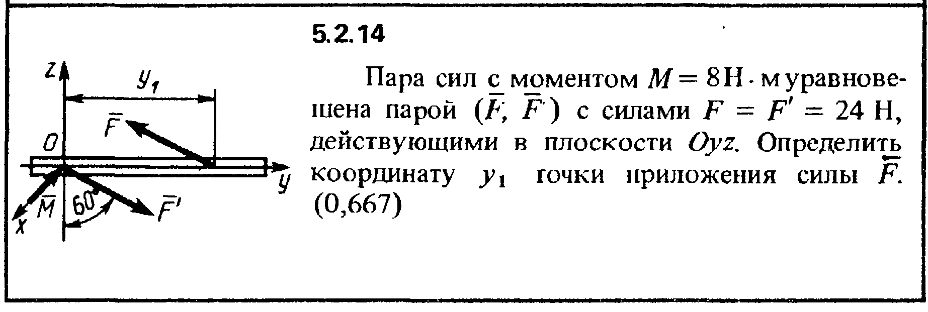 Пара сил с моментом М = 8Н·м уравновешена парой (F, F´ ) с силами F = F´ = 24 Н, действующими в плоскости Oyz. Определить координату y1 точки приложения силы F.
