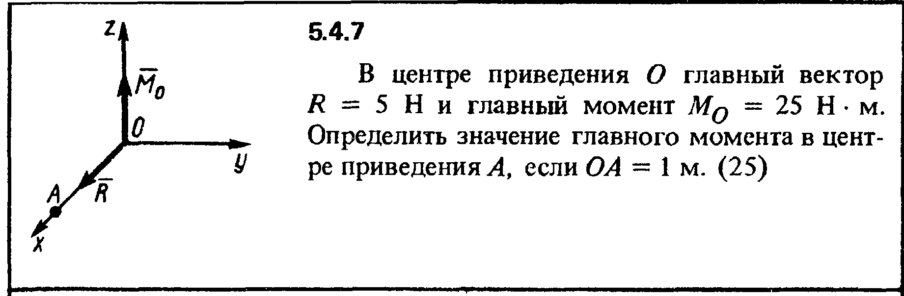5.4.7 В центре приведения О главный вектор R = 5 Н и главный момент МO = 25 Н·м. Определить значение главного момента в центре приведения А, если ОА = 1 м.