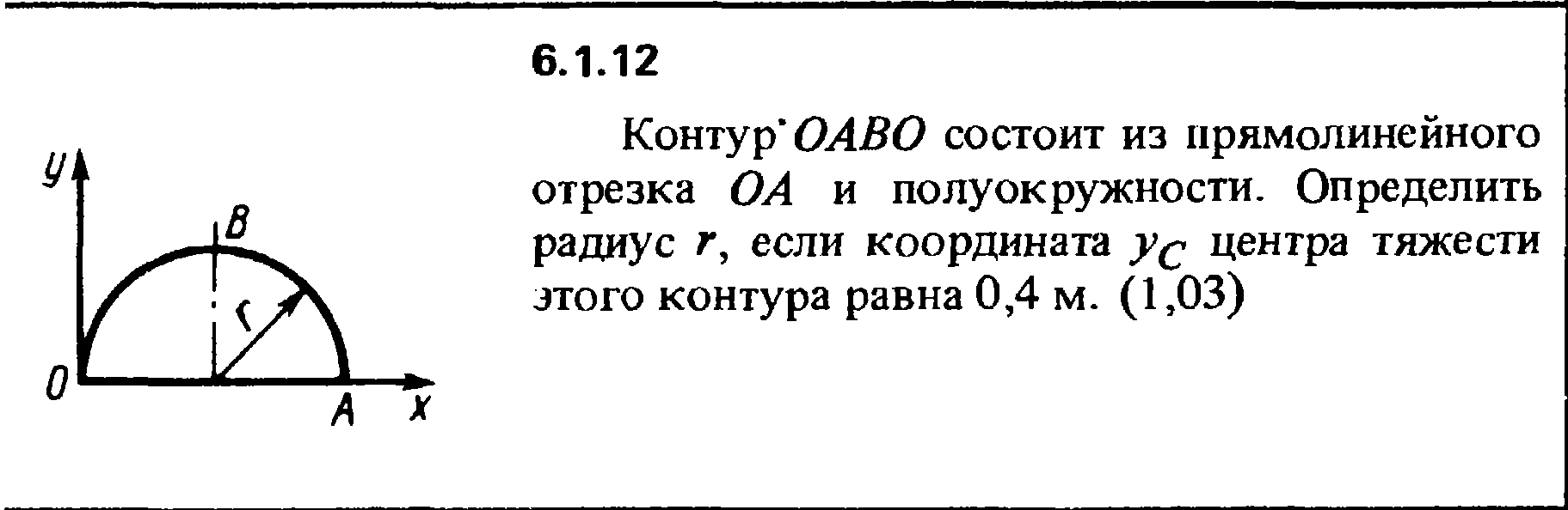 6.1.12 Контур ОАВО состоит из прямолинейного отрезка ОА и полуокружности. Определить радиус r, если координата уC центра тяжести этого контура равна 0,4 м.