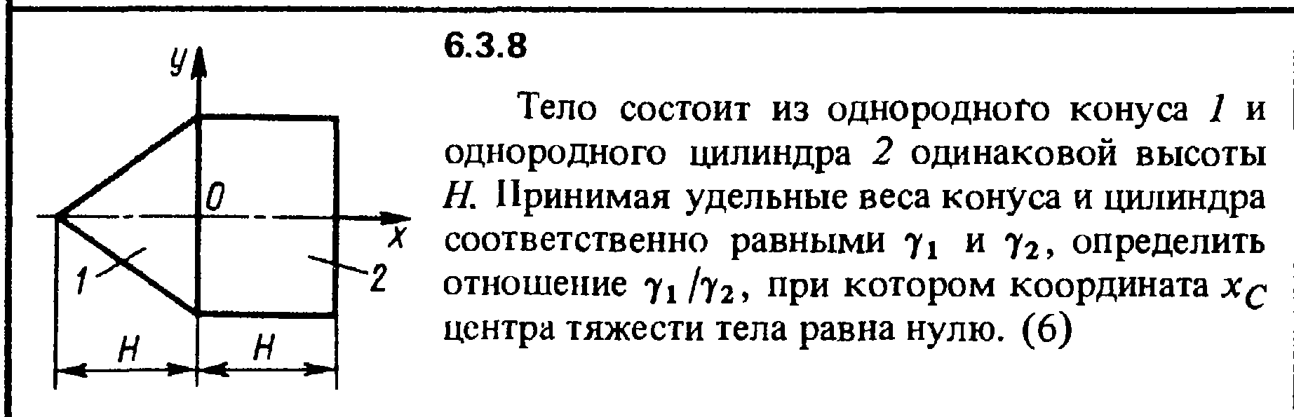 6.3.8 Тело состоит из однородного конуса 1 и однородного цилиндра 2 одинаковой высоты Н. Принимая удельные веса конуса и цилиндра соответственно равными γ1 и γ2, определить отношение γ1/γ2 при котором координата хС центра тяжести тела равна нулю.