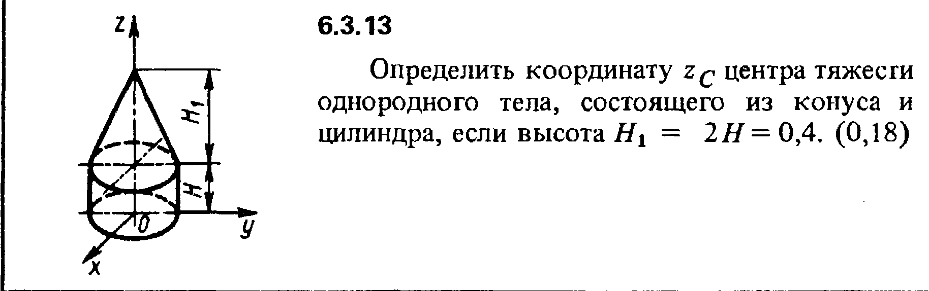 6.3.13 Определить координату zС центра тяжести однородного тела, состоящего из конуса и цилиндра, если высота Н1 = 2Н = 0,4.
