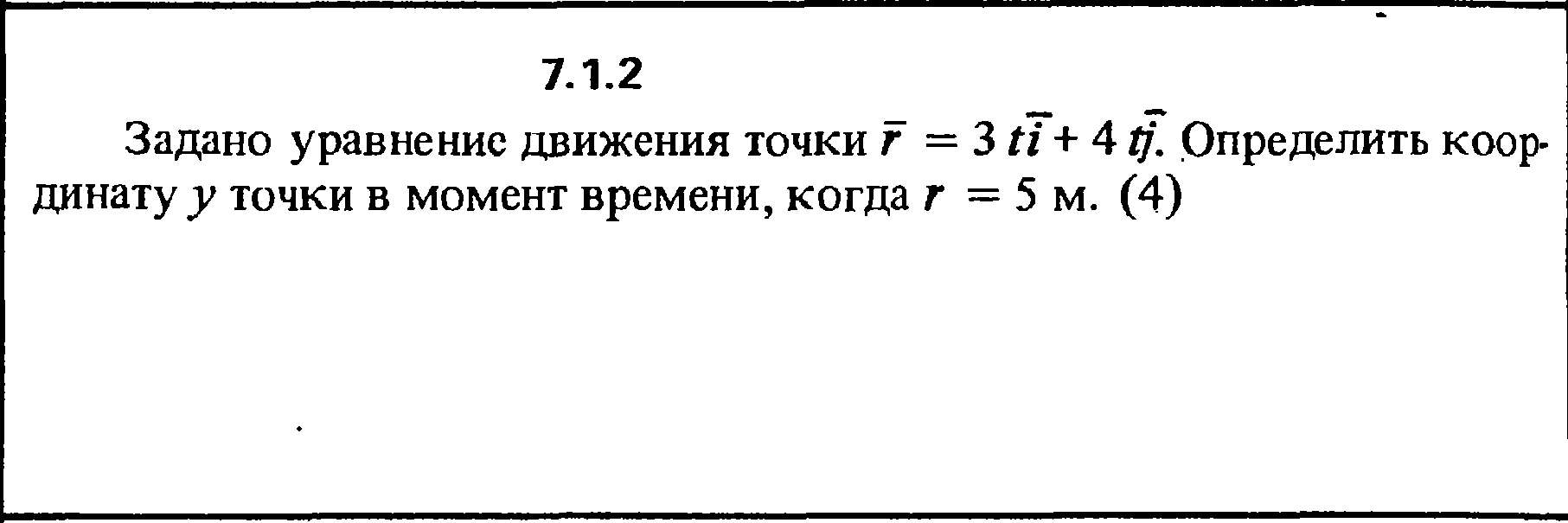Задано уравнение движения точки r = 3ti + 4tj. Определить коор­динату у точки в момент времени, когда r = 5 м.