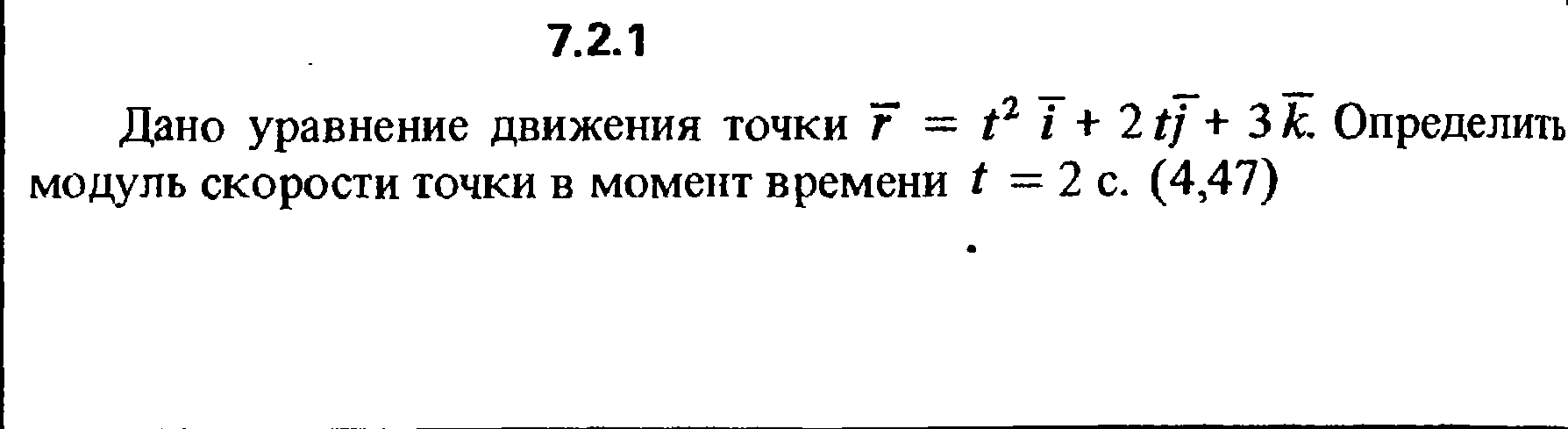 Дано уравнение движения точки r = t2i + 2tj + 3k. Определить модуль скорости точки в момент времени t = 2 с.