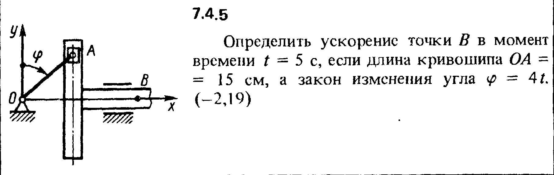 Определить ускорение точки В в момент времени t = 5 с, если длина кривошипа ОА = 15 см, а закон изменения угла φ = 4t.