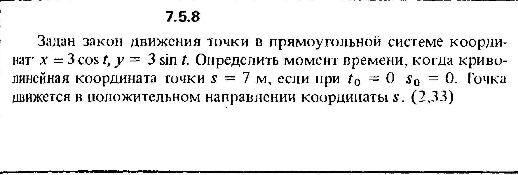 Задан закон движения точки в прямоугольной системе координат х = 3cost, у = 3sint. Определить момент времени, когда криволинейная координата точки s = 7 м, если при t0 = 0 s0 = 0. Точка движется в положительном направлении координаты s.