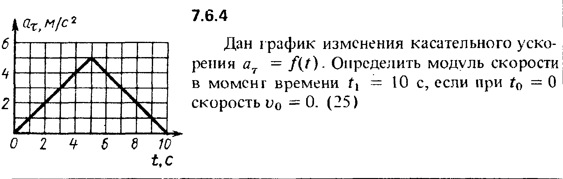 Дан график изменения касательного ускорения аτ = f(t). Определить модуль скорости в момент времени t = 10 с, если при t0 = s скорость v0 = 0.