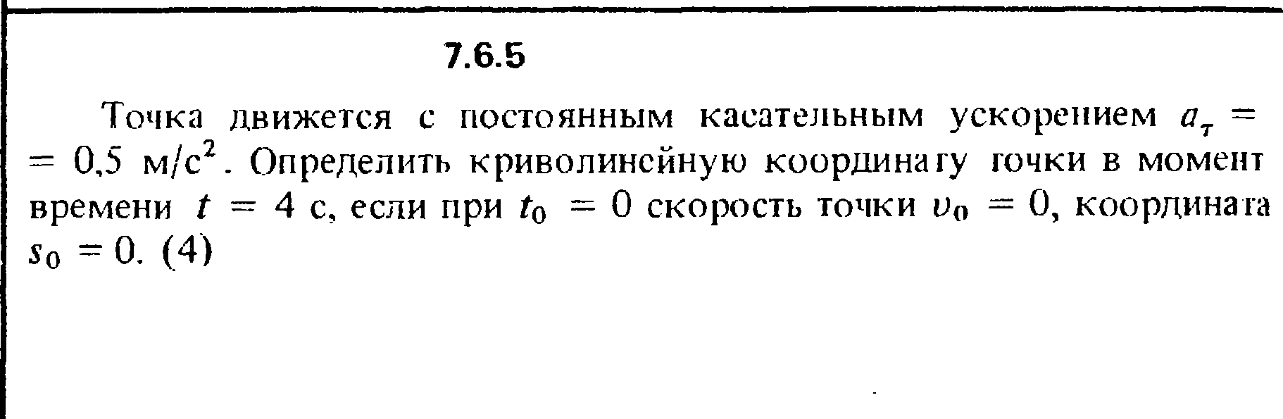 Точка движется с постоянным касательным ускорением аτ = 0,5 м/с2. Определить криволинейную координату точки в момент времени t = 4 с, если при t0 = 0 скорость точки v0 = 0, координата s0 = 0.