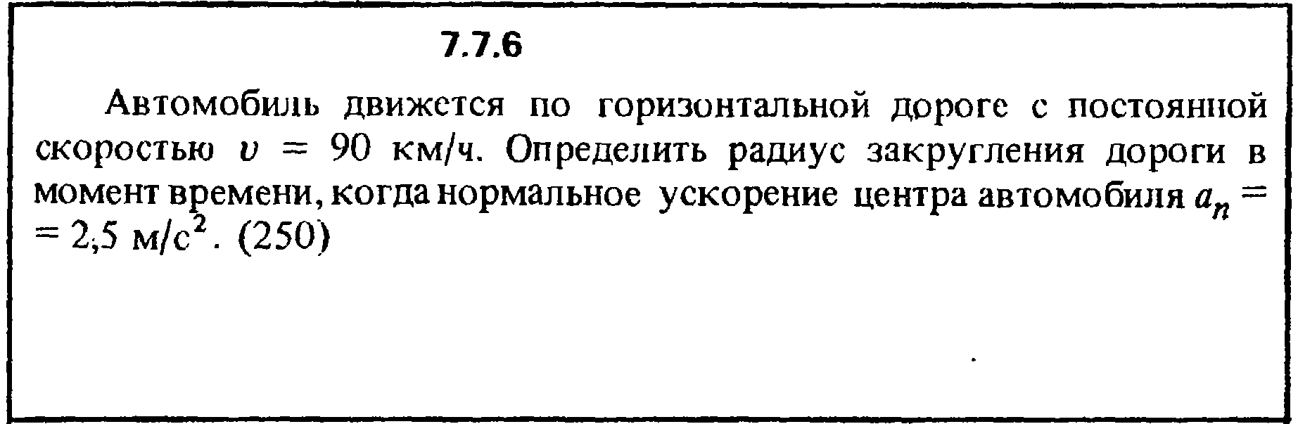 Автомобиль движется по горизонтальной дороге с постоянной скоростью v = 90 км/ч. Определить радиус закругления дороги в момент времени, когда нормальное ускорение центра автомобиля аn = 2,5 м/с2.