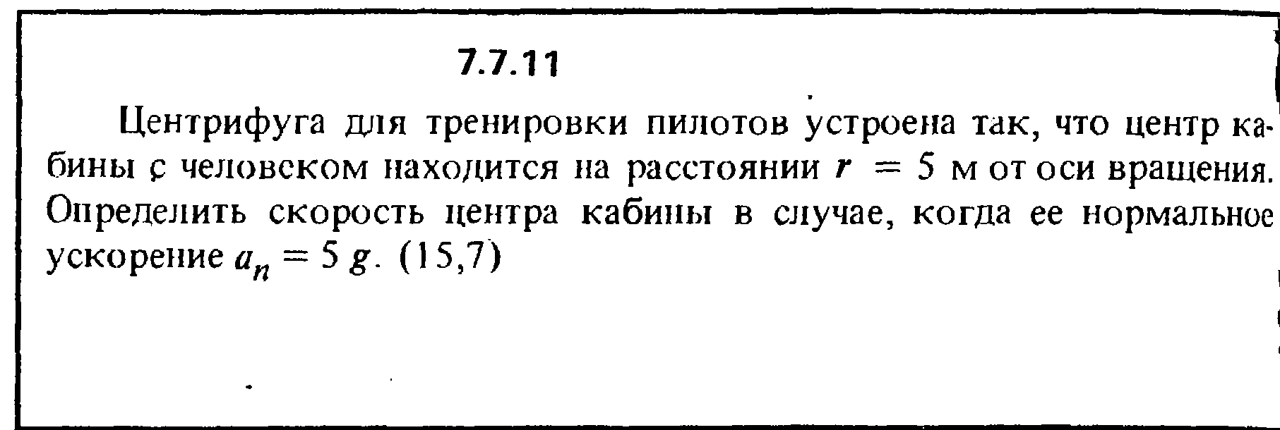 Центрифуга для тренировки пилотов устроена так, что центр кабины с человеком находится на расстоянии r = 5 м от оси вращения. Определить скорость центра кабины в случае, когда ее нормальное ускорение аn = 5 g.