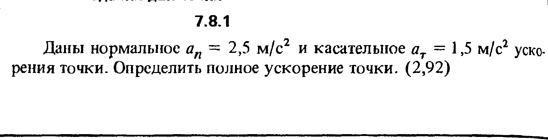 Даны нормальное аn = 2,5 м/с2 и касательное аτ = 1,5 м/с2 ускорения точки. Определить полное ускорение точки.