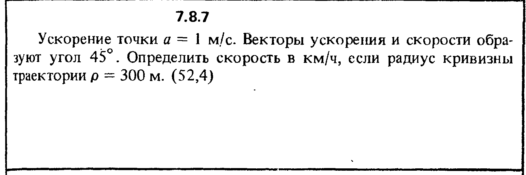 Ускорение точки а = 1 м/с. Векторы ускорения и скорости образуют угол 45°. Определить скорость в км/ч, если радиус кривизны траектории ρ = 300 м.