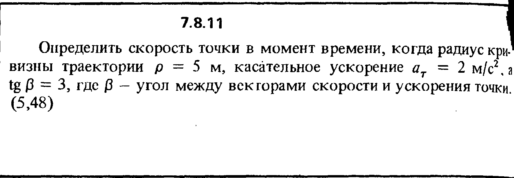 Определить скорость точки в момент времени, когда радиус кривизны траектории ρ = 5 м, касательное ускорение аτ = 2 м/с2, а tg β = 3, где β - угол между векторами скорости и ускорения точки.