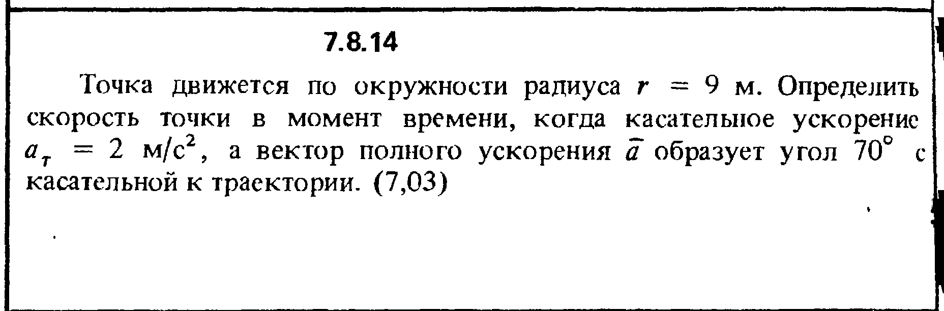 Точка движется по окружности радиуса r = 9 м. Определить скорость точки в момент времени, когда касательное ускорение аτ = 2 м/с2, а вектор полного ускорения а образует угол 70° с касательной к траектории.