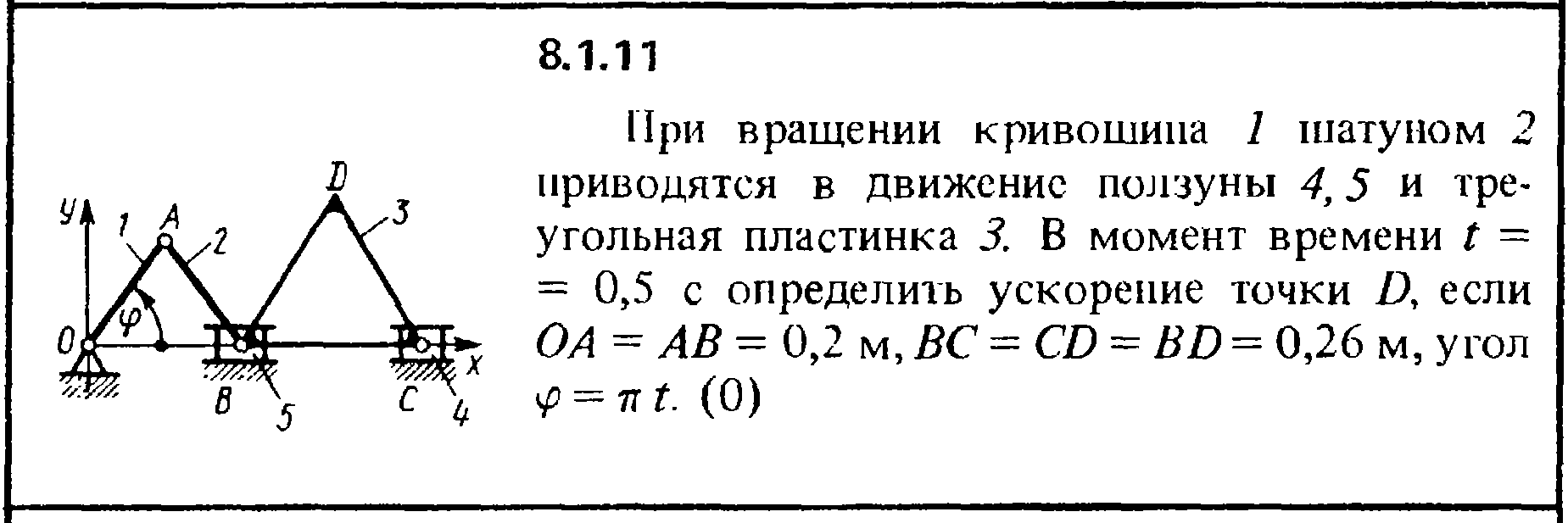 При вращении кривошипа 1 шатуном 2 приводятся в движение ползуны 4, 5 и треугольная пластинка 3. В момент времени t = 0,5 с определить ускорение точки D, если ОА = АВ = 0,2 м, BC = CD = BD = 0,26 м, угол φ = πt.